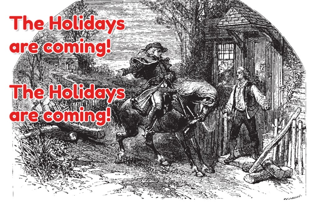 It’s that time of year again. Imagine Paul Revere, riding his horse through town shouting: The Holidays are Coming! The Holidays are coming!